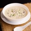 eine leichte Suppe aus frischen Champignons und indischen Kräutern, garniert mit Sahne