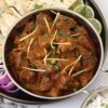 eingelegte Lammfleischstücke gebraten mit Knoblauch, Zwiebeln, Paprika, frischem Ingwer und Gewürzen